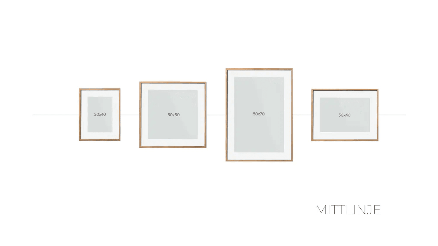 Vill du ha tavlorna enbart en nivå; ingen tavla ovanför eller nedanför? Då kan man placera ut tavlorna efter deras mittlinje. Tänk dig att det är en osynlig linje som centrerat löper genom samtliga tavlor. Det spelar inte någon roll om det är olika storlekar på ramarna, det viktiga är att tavlorna tillsammans följer en mittlinje.