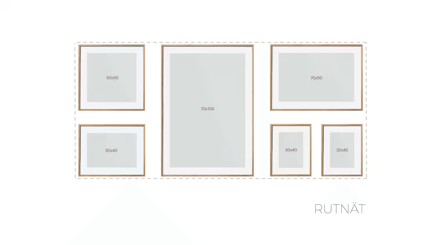 Om du är ute efter ett städat och stilrent uttryck, bör du utgå från väggen som ett rutnät, där tavlorna har samma bredd mellan varandra. Att placera tavlorna i linje med varandra skapar en tydlighet. Du kan utgå från tavlornas ytterkonturer för att skapa en rektangulär mall med motiv inuti.